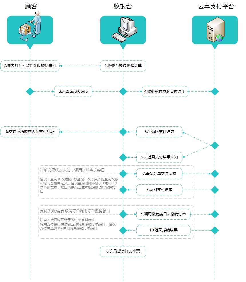 注意:商户调用支付接口发起支付请求之后,支付后台返回交易状态的参数为0(未知),商户系统再轮询调用查询订单接口来确认当前用户是否已经支付成功。撤销订单:交易撤销、关闭,在交易状态未知的情况下发起。明确交易成功,需要退款请调用refund接口