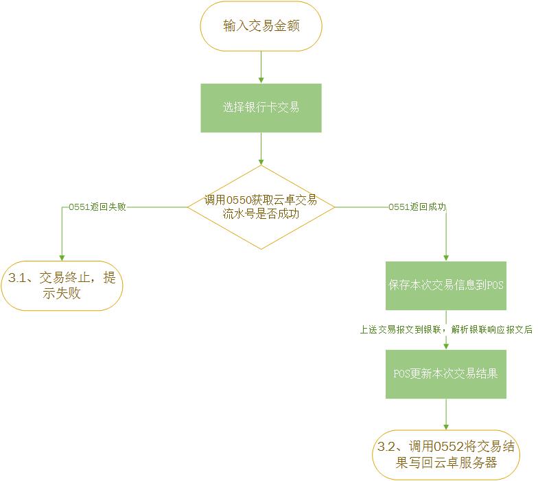 3.2、 0551返回成功,先将本次交易的信息连同云卓交易流水号一并保存在POS机,再上送交易报文到银联;解析银联响应的报文后,更新本次交易的交易结果,并调用0552将交易结果写回云卓服务器。