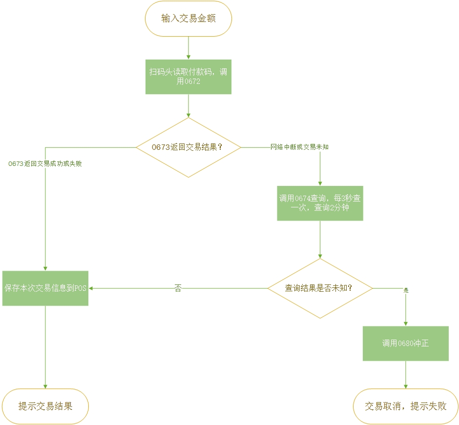 第三步:调用0672,在返回的0673中获取交易结果;如果网络中断,或返回交易未知,调用0674进行查询,建议每3秒查询一次,大约查询2分钟,最终查询仍然未知,调用0680进行冲正,最多冲正3次。最终的交易结果保存在POS,对于未知的,营业员可后续手动查询。查询过程中,营业员选择取消,中止查询,并调用0680进行冲正,最多冲正3次。